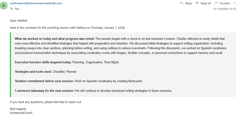 Let us know what you think. We do not need you to spend a lot of time on these Summaries but do be grammatical and tactful as the parents will see what you write! Your comments on this new process are welcome, send to dennis@homeworkcoach.com.